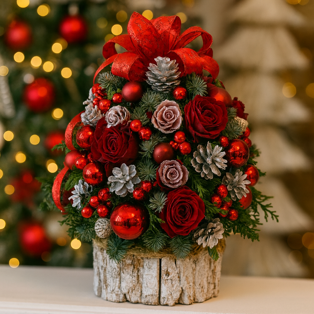 Aranjament de Crăciun realizat manual cu brad natural, decorat într-un stil luxuriant cu trandafiri roșii, conuri ninse, globuri strălucitoare și bobițe festive care creează un efect impresionant și elegant. Forma piramidală și funda roșie amplă din vârf adaugă un aer sofisticat, transformând aranjamentul într-o piesă centrală perfectă pentru masa festivă, recepție sau orice colț special din casă. Combinația armonioasă dintre elementele naturale și cele decorative oferă o atmosferă caldă și rafinată, specifică sărbătorilor.