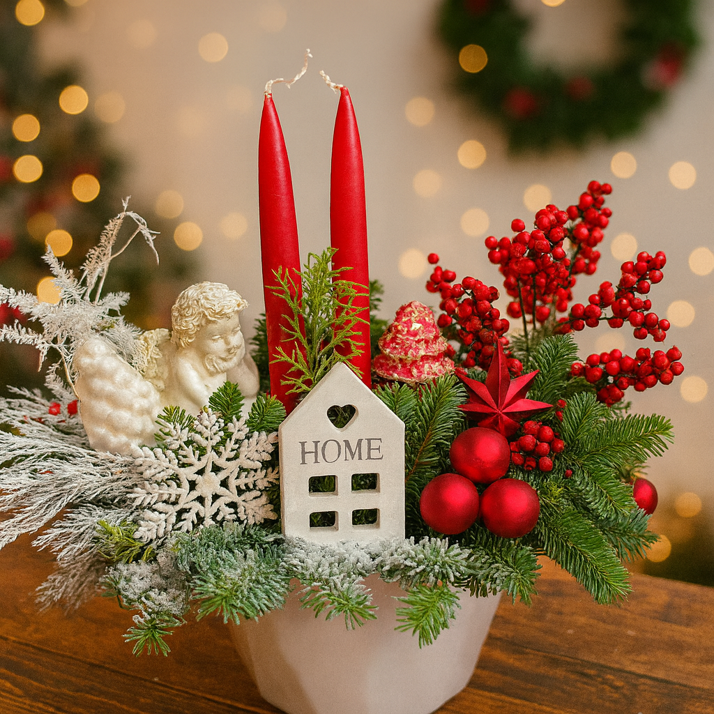 Aranjament de Crăciun realizat manual cu brad natural, îmbogățit cu accente clasice în nuanțe de roșu și alb, pentru a crea o atmosferă caldă și festivă în orice locuință. Compoziția include două lumânări decorative roșii, un îngeraș elegant, ramuri înghețate, globuri roșii și boabe decorative, alături de o căsuță cu mesajul „HOME” care adaugă un plus de farmec și intimitate. Echilibrul dintre elementele naturale și ornamentele tradiționale oferă aranjamentului un aspect armonios și plin de spiritul sărbătorilor.