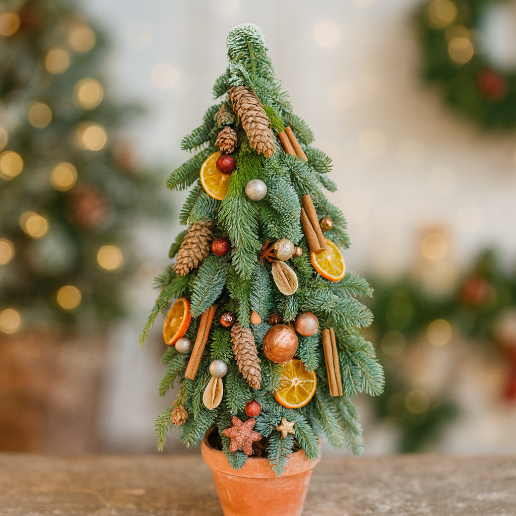 Aranjament de Crăciun realizat manual cu brad natural, conceput sub forma unui brăduț decorativ ce aduce farmecul sărbătorilor în orice spațiu. Brăduțul este împodobit cu elemente tradiționale precum conuri naturale, felii de citrice uscate, batoane de scorțișoară, globuri în nuanțe calde și accente rustice care îi conferă un aer autentic și plin de prospețime. Aspectul natural și detaliile atent integrate fac din acest aranjament o piesă ideală pentru mese, birouri sau colțuri festive din interiorul locuinței.