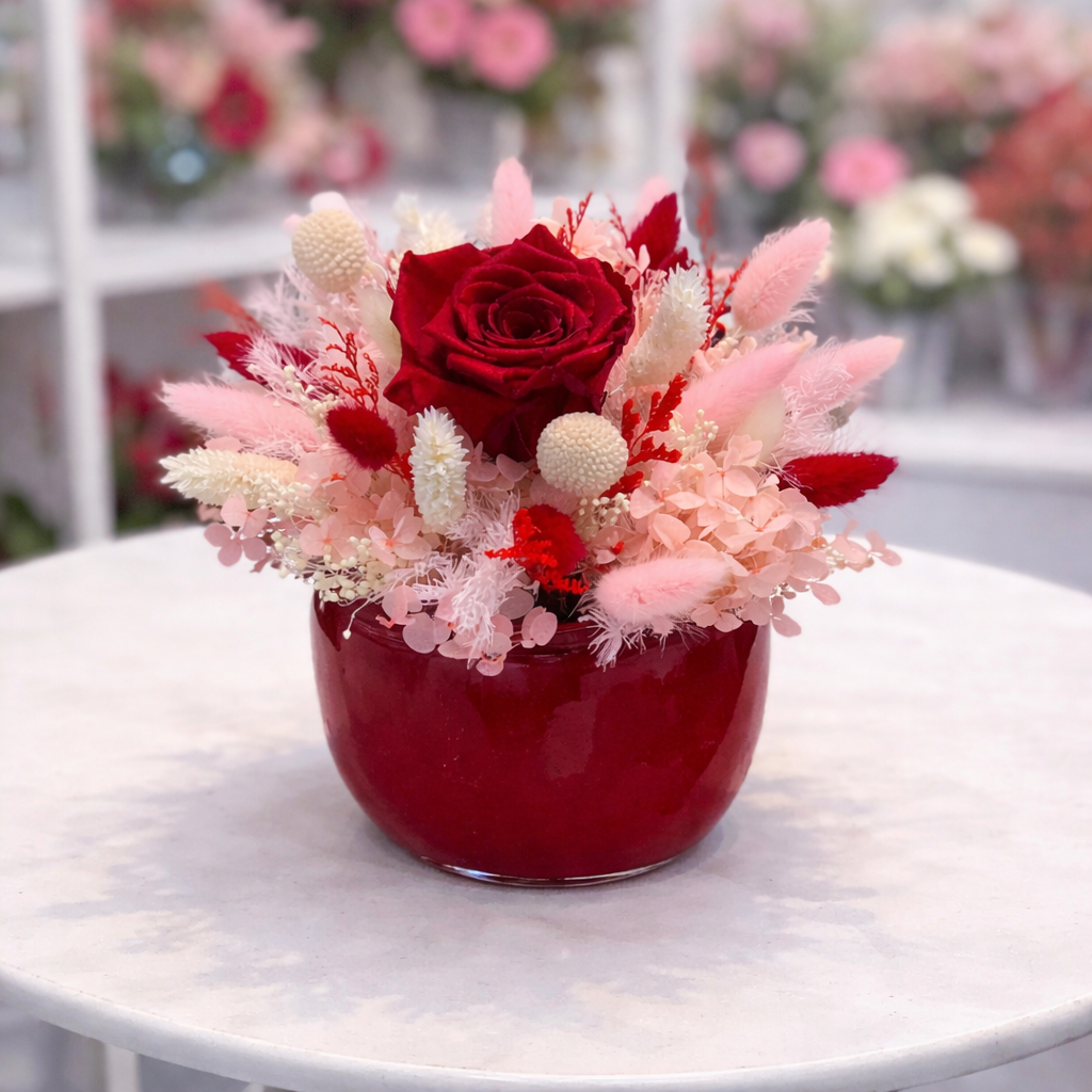 Acest aranjament rafinat combină frumusețea impecabilă a unui trandafir stabilizat roșu , delicatețea hortensiei stabilizate și texturile fine ale plantelor uscate , toate așezate cu migală într-un vas ceramic lucios, perfect armonizat cu nuanțe compoziției. Florile stabilizate păstrează aspectul natural și prospețimea pentru ani de zile , fără apă sau întreținere – transformând fiecare cadou într-o amintire durabilă.