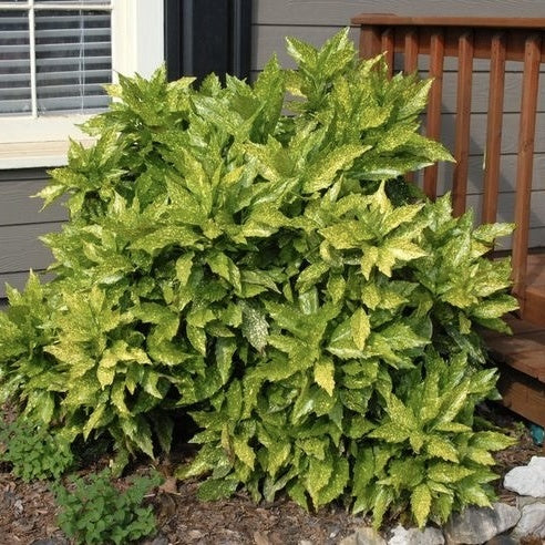 Aucuba japonica, cunoscuta si ca Pomul de Aur, este un arbust vesnic verde cu frunzis lucios, spectaculos, presarat cu pete galbene aurii. Este extrem de decorativ pe tot parcursul anului, ideal pentru gradini umbroase, ghivece de terasa sau spatii interioare luminoase. Se remarca prin rezistenta sa si întretinerea minima.