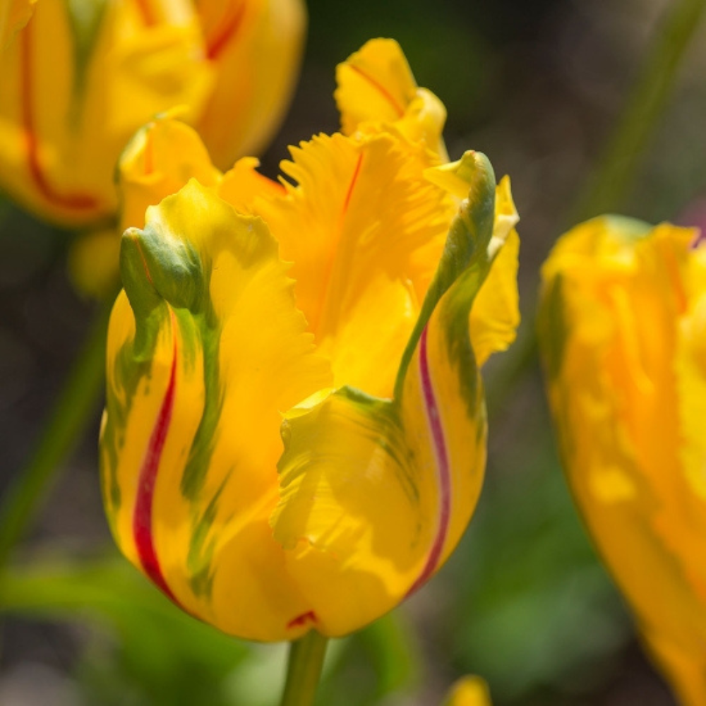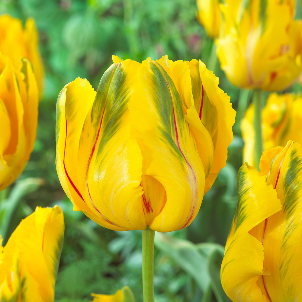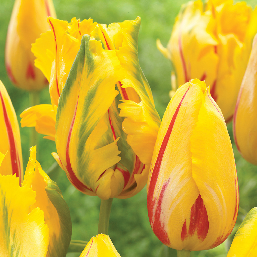 Lalelele La Courtine Parrot sunt o alegere deosebită pentru cei care doresc să aducă un strop de exotism și rafinament grădinii lor. Aceste lalele se remarcă prin florile mari, cu petale galbene, frumos evidențiate de accente verzi la margini și striații roșii longitudinale delicate. Forma lor unică, caracteristică lalelelor „parrot”, le face perfecte pentru a crea aranjamente spectaculoase, fie în grădină, fie în ghivece. Înflorirea lor primăvara transformă orice spațiu într-o adevărată operă de artă florală.