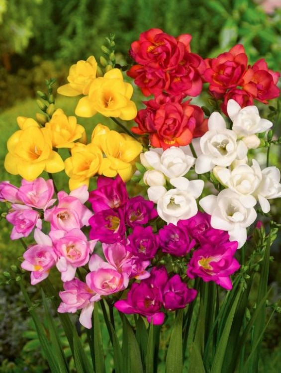 Frezia Mixt Double oferă un spectacol colorat și parfumat, cu flori duble în nuanțe variate – roz, galben, alb, violet și roșu. Este alegerea ideală pentru a crea un decor vesel și pentru buchete parfumate.